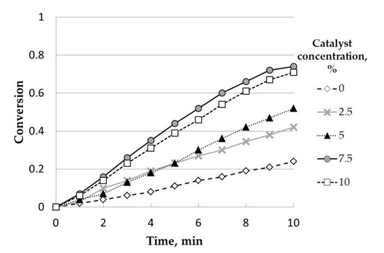 Finally, the effect of catalyst concentration was included in Figure 9. Catalyst concentration also had a positive effect on conversion, up to 7.5% w/w. Thus, there were no differences between 7.5 and 10.0% w/w. This could be due to a saturation effect. Compared to the uncatalyzed sample (0% w/w), clear differences were observed when K2CO3 was added, pointing out the high catalytic activity of this catalyst. Accordingly, 7.5% w/w was chosen as the optimum catalyst concentration for further analysis.