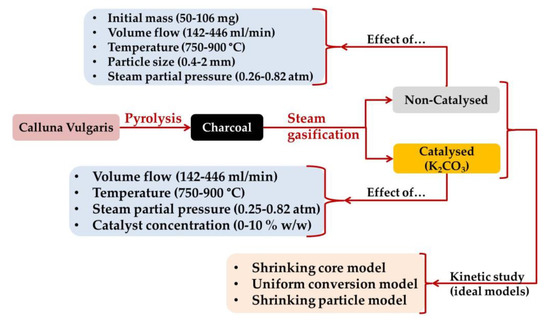 - Concerning the catalyzed steam gasification of heather (by using K2CO3), a positive influence of catalyst concentration was found up to 7.5% w/w. The kinetic study showed activation energies of 99.5 and 114.8 kJ·mol−1 and order of reactions (for steam) of 1/2 and 2/3, according to the two selected ideal models (Shrinking core model and Uniform conversion model).