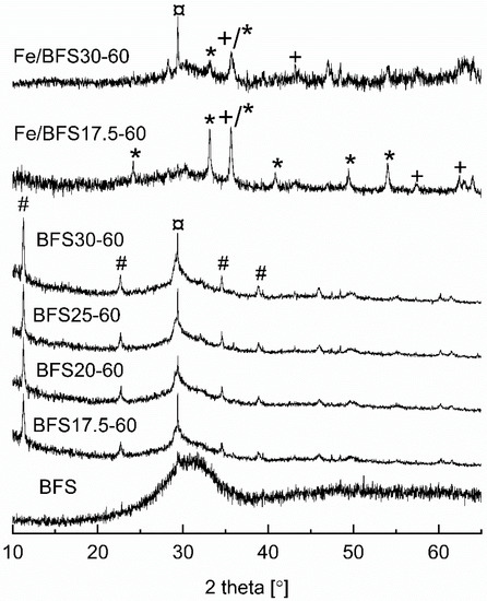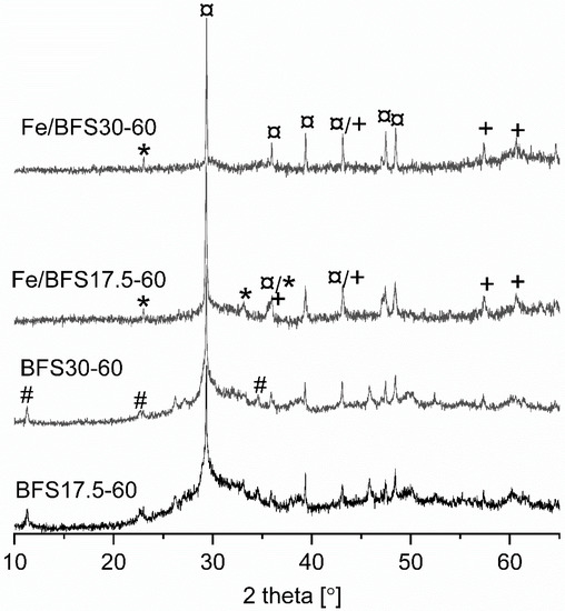 3 phase (¤, ICDD file 01-083-4609) was observed in all samples. Moreover, in the X-ray diffractograms of Fe/BFS17.5-60 and Fe/BFS30-60, the Fe