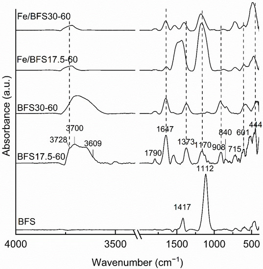 Figure 2 shows the DRIFT spectra of BFS, BFS17.5-60, BFS30-60, Fe/BFS17.5-60, and Fe/BFS30-60. In the DRIFT spectrum of the BFS raw material, only a few peaks were observed. The band at ~1420 cm