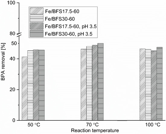 60]. The effect of pH on the degradation level of BPA was investigated at pH 3.5, in addition to the initial pH (6–7) by using Fe/BFS17.5-60 and Fe/BFS30-60 catalysts. The effect of pH was examined at 50 °C, 70 °C, and 100 °C. The pH of the BPA solution was adjusted to 3.5 using 2.0 M HNO