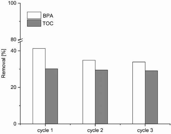Figure 6). Furthermore, BPA removal after the third experiment, which used Fe/BFS17.5-60 twice, was practically the same (34%) as that observed in the second run, indicative of the catalyst’s stability for multiple cycles in the CWPO of BPA. However, the removal of BPA after three cycles using Fe/BFS17.5-60 was around the same as that using BFS17.5-60 for one cycle, revealing that the addition of Fe does not significantly affect catalytic activity due to the basic reaction pH. Moreover, TOC results confirmed the reusability of Fe/BFS17.5-60, while BPA removal was the same during the three consecutive tests.