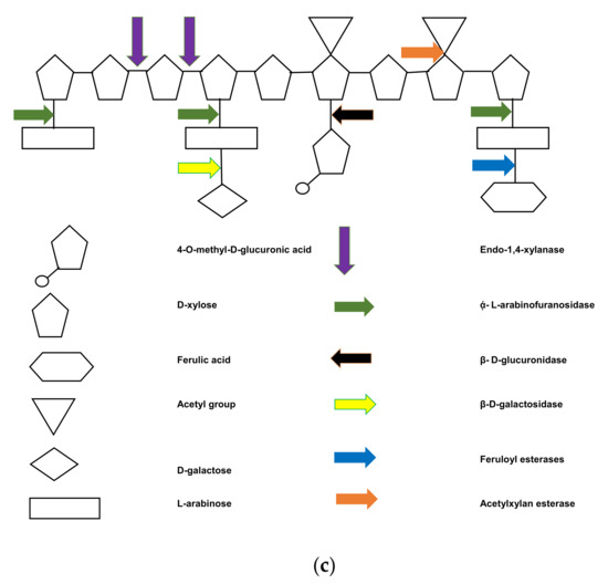 | Cellulose | Cellulolysis | (holocellulolysis) | β-glucosidases Cellulases Endo-glucanase Exo β-1.3-β-1.4-glucanase Acetyl xylan esterase Cellulase-free xylanase Arabinofuranosidase α-arabinofuranosidase, feruloyl esterase | Bacillus sonorensis BD92 N. mirabilis Bacillus subtilis CBS31 Thielavia terrestris Co3Bag1 Alkalibacillus favidus Paenibacillus sp. N1 Streptomyces lividus Aspergillus hortai CRM1919, Lactobacillus crispatus | [36,37,38,39,40,41,42,43,44,45] |