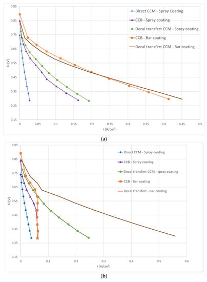 For CCB preparation, anode and cathode catalyst layers were coated on a GDL. Both GDLs were hot pressed on the membrane to obtain a MEA. The cathode CL was printed either using a spray coating or bar coating process.