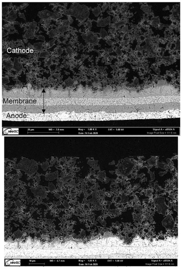 SEM observations were conducted using a field emission gun scanning electron microscope (FEG-SEM) Leo 1530 from Zeiss (Oberkochen, Germany), with an accelerating voltage of 5 kV and a Rutherford backscattering detector RBSD. This detector generates a better contrast between each part of the observed samples. Cross-sections of MEAs were cut in the center zone, embedded into epoxy-resin and polished, after the electrochemical characterization in the single cell test. The images presented in this paper were produced one day after polishing.