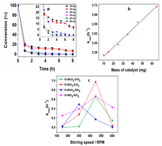(a) Variation of catalyst concentration (5%MoO3-ZrO2), (b) initial rate as a function of the catalyst mass (5%MoO3-ZrO2), and (c) the influence of stirring speed vs. initial rate on ring opening of cyclohexene oxide utilizing distinct catalysts.