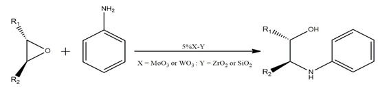 Epoxides are important molecules in organic synthesis due to their reactivity with a wide range of nucleophiles [14]. They are considered as good starting materials for a range of useful materials. They are ring-opened into β-amino alcohols which can be acquired from reacting an epoxide with an excess of amine [23]. For the most part, alkylamines are harder bases compared to aromatic amines; hence, they compete more efficiently with an epoxide for the catalyst surface. This is entirely in line with the ‘hard-soft acid-base’ theory, but harder amines will turn out to retard the rate of reaction [15,24]. Selectivity and activity studies can be determined by kinetic investigation which provides mechanistic evidence of the chemical processes. Information about the reaction mechanism can sometimes be dictated by a non-kinetics investigation; however, little can be known about the mechanism until its kinetics have been investigated thoroughly [25]. Herein, we report a mild procedure for the conversion of aniline and epoxides into the corresponding β-amino alcohols in excellent yields, using 5% tungsten- and molybdenum-promoted mesoporous ZrO2 as catalysts (Scheme 1).