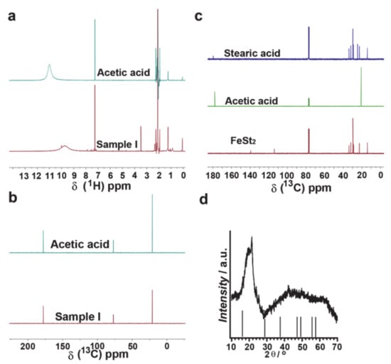 Figure 1a,b shows 1H and 13C NMR analysis of the product (Sample I) collected by the ‘double trap’, which was generated after loading iron acetate, SA and 1-ODE into the reaction vessel and heating at 60 °C and 130 °C for half an hour, respectively. In Figure 1a, the formation of acetic acid is revealed by the strong intermolecular hydrogen bonding in carboxylic acid dimers, which leads to very low-field broad signal δ = 9.74 (sample I) and 11.00 (commercial, acetic acid, ≥99.7%, Sigma-Aldrich) in the range of 9–15 ppm. The up-field proton signal is similar between Sample I and commercial acetic acid, such as the singlet at around 2 ppm is also characteristic (CH3) of acetic acid. Further evidence is provided by the 13C NMR spectra, as shown in Figure 1b, in which identical carbon shifts are observed for Sample I and acetic acid standard sample.