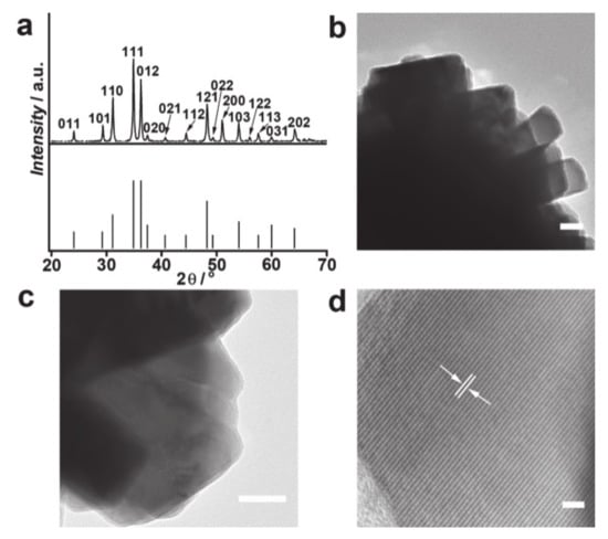 (a) Powder XRD pattern of as-prepared FeSe2 nanocrystals through employing FeSt2 as an iron precursor and OLA for solubilization of Se. The vertical lines on the bottom correspond to orthorhombic marcasite-type structures of FeSe2 (PDF = 21-0432 and 74-0247). (b,c) TEM analysis of as-prepared FeSe2, the scale bar is 50 nm. (d) HRTEM analysis of as-prepared FeSe2 resolved the reflection from the (110) plane, with a lattice spacing of 3.8 ± 0.2 Å, the scale bar is 2 nm.