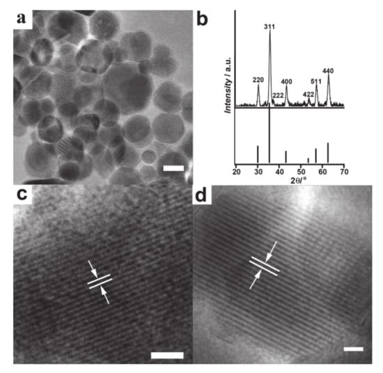 TEM (a), XRD (b) and HRTEM (c,d) analysis of as-prepared Fe3O4 nanoparticles. (a) TEM analysis of Fe3O4 nanoparticles with scale bar equal to 20 nm. (b) Powder XRD pattern of as-prepared Fe3O4 NCs by Scheme 3, the vertical line on the bottom corresponds to face centered cubic Fe3O4 (PDF = 75-0033). (c,d) HRTEM of Fe3O4 resolving the lattice spacing of the (220) plane is 3.0 ± 0.2 Å and (111) plane is 5.0 ± 0.2 Å. The scale bar in HRTEM images is all equal to 2 nm.
