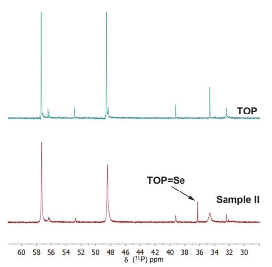 31P NMR analysis of reaction intermediates during the reaction of FeSe2 with TOP. The top spectrum corresponds to standard TOP. The bottom spectrum corresponds to Sample II, taken from the crude reaction mixture by J. Young NMR tube.