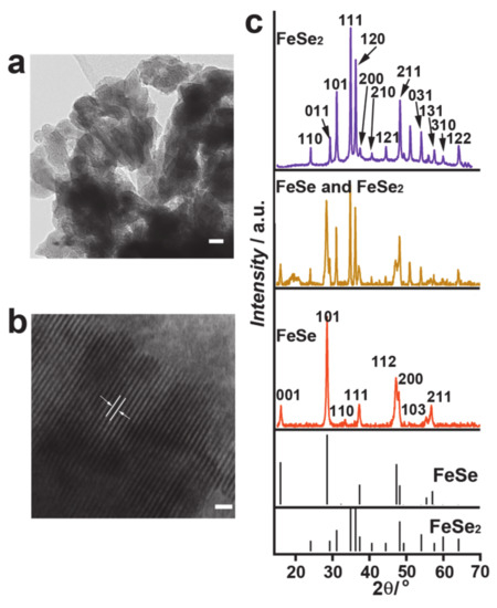 Figure 2b,c displayed the TEM analysis results, which exhibits the expected layer type morphology] The HRTEM in Figure 2d resolved the reflection from the (110) plane, with a lattice spacing of 3.8 ± 0.2 Å, which is close to the value for single crystal orthorhombic iron diselenide.