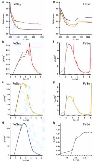 Figure 6a,e shows the multiple total reflection measurements on different areas of the glass slides covered by FeSe2 and FeSe, respectively. Since it is difficult to ensure the homogeneous coverage of the slides by drop-casting, the position of the slide was directed toward the light source together with multiple measurements to minimize errors. By transforming the reflectance experimental data (Figure 6a,e) following Equations (1)–(3), the optical band gap of FeSe2 (Figure 6b–d) and FeSe (Figure 6f–h) were predicted from the intercepts of the tangent line of the curves to the abscissa.