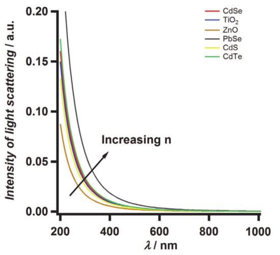 Rayleigh scattering of semiconductors as a function of wavelength, as determined by employing Equation (4). The arrow indicates the effect of increasing of refractive index.