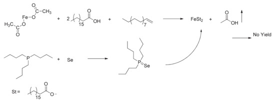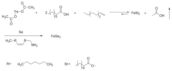 Furthermore, as discussed earlier in Scheme 2 and Scheme 3, the formation of FeSt2 and Se-C organoselenium species is crucial to achieving high purity FeSe2 without the formation of Fe3O4. Therefore, an excess amount of SA, vacuum drying and suitable selenium precursors are the critical factors in the FeSe2 NCs synthesis through the ‘hot-injection’ approach. It should be noted that the organic metallic chemical synthesis of iron nanoparticles, iron metal or iron-nonmetal alloy is also a rather complex reaction process [59]; however, similar approaches to our current work could be carried out in the future to elucidate the underlying synthetic mechanisms.