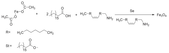 Plausible reaction scheme for the synthesis of Fe3O4 from Fe(Ac)2 and OLA. It should be noted that OLA shows on the arrow refer to the solvent for preparing the Se precursor.