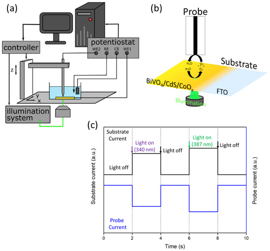 To investigate the local PEC activity of the designed photoanodes, SPECM measurements were carried out to locally detect the photocurrent and the O2 production from the reaction occurring at the sample. The SPECM setup is presented in Figure 6a. Acquisitions were made in a mode similar to the substrate generation—tip collection mode [48] (localized substrate photogeneration in our case) with synchronized light pulses, as presented in Figure 6b. This allows to measure the photocurrent from the sample and the oxygen reduction reaction (ORR) current at the microelectrode at each point of the scan. The currents during the last 10% of each light pulse were averaged, and the current values were transformed into a map at each wavelength and each position of the xy stage. The illumination time was chosen to reach a steady-state current during the averaged current calculation. A single measurement corresponding to one position of the xy stage is depicted in Figure 6c.