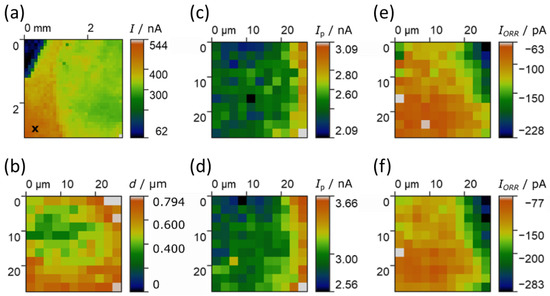 (a) A large photocurrent map with an illumination (λ = 340 nm) spot size of r = 50 µm was obtained as an overview. Simultaneous measurements with a small spot illumination (r = 2.5 µm) were performed yielding images of the topography via shear force sensing (b), the photocurrent at the sample at 340 nm (c) and 387 nm (d) and ORR current at the microelectrode (rT = 5 µm) at 340 nm (e) and 387 nm (f).