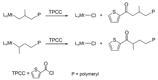 In our previous works, acyl chloride (RCOCl) was used as a quenching agent to selectively label an RCO group on the end of each polymer chain that connected with the central metal of the active site in catalytic olefin polymerization [19,20,21,22]. The quench-labeling reactions can be depicted in the following equations (see Scheme 1), wherein thio- phene-2-carbonyl chloride (TPCC) was used as the quenching agent and propylene was the monomer: