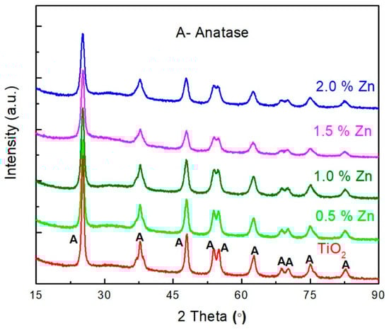X-Ray Diffraction (XRD) patterns of the undoped and Zn-doped TiO2 nanomaterials.