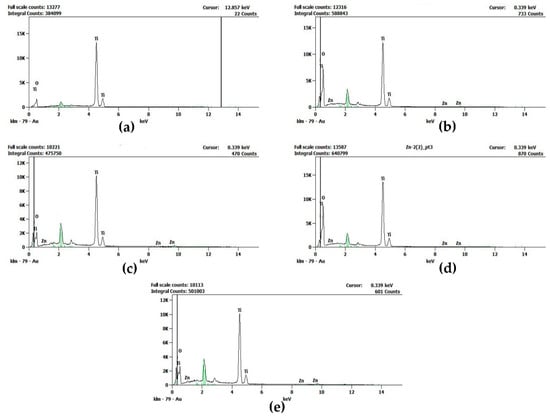 Energy Dispersive X-ray (EDX) spectroscopic images of (a) undoped, (b) 0.5 mol% Zn-doped, (c) 1.0 mol% Zn-doped, (d) 1.5 mol % Zn-doped, and (e) 2.0 mol% Zn-doped TiO2 nanomaterials.