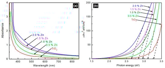 (a) UV-visible absorption spectra of undoped and Zn-doped TiO2 nanomaterials; (b) Tauc-plot on estimated bandgap values of undoped and Zn-doped TiO2 nanomaterials.
