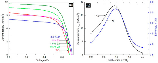 The photovoltaic performance of the fabricated DSSCs with undoped and Zn-doped TiO2 photoanodes was tested under simulated irradiation of intensity 100 mW/cm2 with Air Mass (AM) 1.5 filter. The results are illustrated in Figure 4, and the related photovoltaic parameters are summarized in Table 2.