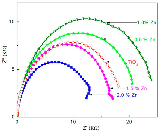 As shown in the Figure 5, these Nyquist plots are related to the charge recombination resistance (R2) across the TiO2/electrolyte interface, with a partial contribution from electron transport and accumulation in TiO2 photoanode [39]. R2 value of the undoped and Zn-doped TiO2 photoanodes-based DSSCs can be estimated from the diameter of the respective semicircles [13]; a high R2 value indicates low charge recombination rate [13,40]. In the present study, the R2 value of undoped TiO2 is lower than those of 0.5 and 1.0 mol% Zn-doped TiO2 based DSSCs and higher than that of 1.5 and 2.0 mol% Zn-doped TiO2 based device. Hence, the lowest charge recombination rate is attributed to the 1.0 mol% Zn-doped TiO2 based device. These results are in good agreement with the JSC values and the corresponding η values of the fabricated devices.