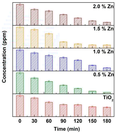 Photocatalytic degradation of MB using Zn-doped and undoped TiO2 nanomaterials was performed under direct sunlight. Prior to the light exposure, the reaction suspension was allowed to establish adsorption-desorption equilibrium by stirring the suspension in dark for 30 min. Subsequently, the suspension was exposed to direct sunlight for a stipulated period (noon daytime) during which the MB retained in the suspension was measured at regular time intervals. The concentration of MB decreased with time, and the absorption peak corresponding to MB (λ = 663 nm) was found to disappear after 2.5 h. The concentration vs. time plots obtained for different Zn-doped TiO2 (0.5, 1.0, 1.5, and 2.0 mol%) and undoped TiO2 samples are depicted in Figure 6.