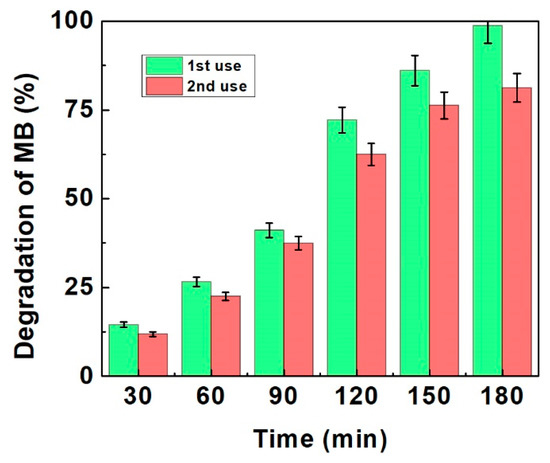 As shown in Figure 7, the photocatalyst did not exhibit any significant loss in the 2nd cycle of degradation of MB under the same conditions. The calculated degradation percentage were found to be 99% and 82% for 1st and 2nd use, respectively. The results confirm that the synthesized Zn-doped TiO2 photocatalyst shows good stability and sustainability. Moreover, the rate of the photocatalytic degradation results obtained in this study is compared with that of the literature and summarized in the Table 4.