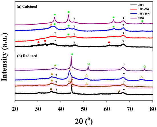 The XRD patterns of the (a) calcined and (b) reduced monometallic and bimetallic catalysts are presented in Figure 1. The XRD patterns of calcined 20Fe/γ-Al2O3 and 20Ni/γ-Al2O3 catalysts confirm that Fe is present as Fe2O3 phase (JCPDS 52–1449) and Ni as NiO phase (JCPDS 65–6920), respectively. For the 20Fe/γ-Al2O3 catalyst, the XRD peaks of Fe2O3 were too broad due to the high dispersion of iron over the support [16,17]. With an increase in Ni in Fe catalysts, peaks of NiO gradually increased and an additional peak was observed at 43.7° corresponding to the formation of NiFe2O4 (JCPDS 89–4927). However, no peaks of Fe2O3 were observed in Fe-Ni/γ-Al2O3 catalysts. For the 15Fe-5Ni/γ-Al2O3 catalyst, low intensity of both Fe and Ni oxide was observed compared to the 20Fe/γ-Al2O3 catalyst, indicating better dispersion of Ni over the Fe catalyst [18,19,20,21,22,23,24]. Alternatively, for the 10Fe-10Ni/γ-Al2O3 catalyst, peaks of NiFe2O4 were observed, suggesting that a higher Ni ratio increases the interaction between Fe and Ni [18,20]. For reduced catalysts, the 20Fe/γ-Al2O3 showed the Fe3O4 and Fe metal phases, whereas the 20Ni/γ-Al2O3 showed the NiO and Ni metal phases, indicating that both catalysts cannot be completely reduced under reduction conditions. With an increase in Ni in Fe catalysts, peaks of Fe metal gradually decreased and the peaks of NiFe2O4 and Ni3Fe2 alloy were observed. The 15Fe-5Ni/γ-Al2O3 catalyst showed the coexistence of the Fe and Ni3Fe2 phase. Then, the 10Fe-10Ni/γ-Al2O3 catalyst showed no peaks of Fe metal. It can be concluded that the increase of Ni/Fe ratio in the Fe-Ni/γ-Al2O3 catalyst leads to the formation of the alloyed metallic phase. The crystallite sizes of Fe, Ni, or Ni-Fe alloy of reduced catalysts were calculated using the Scherrer equation and the results are listed in Table 1. The crystallite sizes for Ni, Fe, or Ni-Fe alloy in catalysts changed with the composition of the Ni/Fe. Interestingly, the crystallite sizes of the metal in bimetallic catalysts exhibit a smaller size than monometallic catalysts. In particular, the 20Ni/γ-Al2O3 catalyst showed a larger particle size after reduction due to weak interaction with Ni-Al, whereas Ni-Fe catalysts showed a small particle size [25]. It is known that metal dispersion was higher and the synergy effects between Ni and Fe by forming NiFe2O4 were stronger on γ-Al2O3 [20]. Thus, the addition of Ni to the Fe/γ-Al2O3 catalyst seems to increase the metal dispersion.