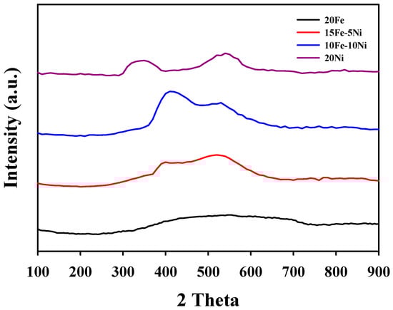 H2-temperature-programmed reduction (H2-TPR) was conducted to investigate the reducibility of monometallic and bimetallic catalysts. Figure 2 showed the TPR profiles of 20 wt.% monometallic catalysts and the 20 wt.% bimetallic catalysts. The 20Fe/γ-Al2O3 exhibited a broad peak of two contributions (~400 °C and~650 °C), representing the presence of different iron species. The peak at 400 °C can be assigned to the reduction of Fe2O3 to Fe3O4, and the reduction peak at 650 °C corresponds to the reduction of Fe3O4 to Fe metal. The 20Ni/γ-Al2O3 showed two peaks; the low-temperature peaks at 300 °C–380 °C were attributed to the reduction of NiO, high-temperature peaks at 480 °C–600 °C were attributed to the reduction of NiO species, corresponding to the interaction between NiO and Al2O3. The bimetallic Fe-Ni catalysts showed three reduction peaks. The first temperature at 340 °C may be attributed to the reduction of Fe2O3 to Fe3O4 or NiO to Ni, corresponding to the weak interaction with support. Then, the reduction peaks from 400 °C to 600 °C, corresponding to the reduction of Fe3O4 to Fe and NiFe2O4 to Fe and Ni [20,21]. In addition, the reduction peaks of the bimetallic catalysts shift to lower temperature with increasing nickel-to-iron ratio, compared with Fe catalyst. This suggests that the addition of Ni improves the reducibility.