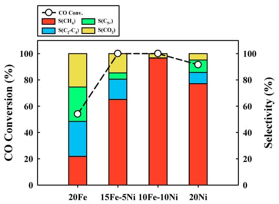 The catalytic behavior of Fe-Ni/γ-Al2O3 catalysts with different Ni/Fe ratios was observed under the conditions of 300 °C, 10 bar, H2/CO = 3.0, and 6000 mL/g/h (Figure 3 and Table S1). The CO conversion was much lower with 20Fe/γ-Al2O3 compared with the value obtained for 20Ni/γ-Al2O3. Ni shows high catalytic activity for CO hydrogenation among transition metals. With increasing Ni in Fe catalysts, the bimetallic catalysts present a higher CO conversion (99.9%) compared to Fe catalysts. It was reported that Fe-Ni bimetallic catalysts not only showed a high metal dispersion but also improved reducibility [18,19,20,21,22,23,24]. This confirms that the addition of Ni to Fe catalysts could facilitate higher dispersion and enhance the reducibility (Table 1 and Figure 2). In addition, the 20Ni/γ-Al2O3 catalyst showed lower CO conversion (91.5%) compared to Fe-Ni catalysts. This drawback of the CO conversion may be in agreement with the low Ni dispersion. The selectivity to hydrocarbon and CO2 is affected by the Ni-Fe ratio. Generally, Ni catalysts exhibited high CH4 selectivity (>90%) with low selectivity of C2+ and CO2 under methanation conditions (H2/CO ratio = 3.0 °C and 300 °C). However, the 20Ni/γ-Al2O3 catalyst showed selectivity of CH4 (77.1%), C2–C4 (8.6%), C5+ (9.4%), and CO2 (4.9%) due to the lower Ni dispersion. It has been reported that high dispersion of Ni exhibited the highest CH4 selectivity, whereas low dispersion of Ni showed selectivity of C2–C4 [26,27]. The 20Fe/γ-Al2O3 catalyst, by contrast, showed high selectivity of C2–C4, C5+, and CO2. Fe metal has more of a long-chain growth ability than Ni metal due to the stronger adsorption of CO in Fe. Moreover, Fe-based catalysts have significant activity in the water gas shift reaction. With increasing Ni in Fe catalysts, there was a remarkable change in selectivity. For the 15Fe-5Ni/γ-Al2O3, the selectivity to CH4 significantly increased from 21.8% to 65.1%, whereas the selectivity to C2–C4, C5+, and CO2 significantly reduced from 26.6% to 15.4%, from 26.2% to 4.8%, and 25.4% to 14.7%, respectively, compared to the 20Fe/γ-Al2O3 catalyst. Interestingly, the 10Fe-10Ni/γ-Al2O3 catalyst almost showed selectivity to CH4 (96.6%). It might be due to the defect in the Fe metal phase with increasing Ni, resulting in XRD of 10Fe-10Ni/γ-Al2O3 showed Ni-Fe alloy phase, which has a much higher methanation reaction than Fe metal [22]. Thus, it could be concluded that the addition of Ni to Fe catalysts changes the metal phase, which not only enhances the CO hydrogenation but also significantly affects selectivity to hydrocarbon and CO2. Among the catalysts, the 15Fe-5Ni/γ-Al2O3 catalyst displayed a high CO conversion and low byproduct formation (C5+ and CO2), but the addition of Ni also decreased the selectivity of C2–C4, indicating that is not enough for HC-SNG. In our previous work, 5Co-15Fe/γ-Al2O3 catalysts showed high C2–C4 selectivity at high CO conversions, but this led to substantial byproducts (C5+ and CO2). Therefore, the effect of Ni on the suppression of byproducts for the 5Co-15Fe/γ-Al2O3 catalyst needs to be investigated further.