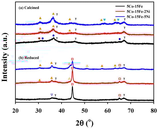 The XRD patterns of Co-Fe and Co-Fe-Ni catalysts in the calcined and reduced states are shown in Figure 4. The calcined Co-Fe catalyst showed very broad peaks of the Fe2O3 phase compared to those of the Co3O4 phase because of the high dispersion of the iron phase over alumina [11]. With increasing Ni in Co-Fe catalysts, the additional diffraction peaks of NiFe2O4 and NiCo2O4 were confirmed. However, for the Co-Fe-Ni catalysts, peaks of Fe2O3 and Co3O4 were difficult to distinguish. In the case of the reduced state, the Co-Fe catalyst showed XRD peaks of CoO and Fe metal, indicating the incorporation of Co into Fe [11,16,17]. With an increase in Ni in Co-Fe catalysts, additional peaks of NiFe3O4 and Ni-Fe alloy were observed. However, for trimetallic catalysts, distinguishing CoO from NiFe3O4 is difficult due to the very close resemblance in diffraction patterns. With the increasing Ni content, the diffraction peaks corresponding to Ni-Fe alloys gradually increased, while peaks of the Fe phase decreased due to the different compositions of the metal alloys. The 5Co-15Fe-2Ni catalyst showed a very broad Ni-Fe alloy peak at 43.7°. For the 5Co-15Fe-5Ni catalyst, the diffraction peaks of the Ni-Fe alloy were more clearly observed compared to the 5Co-15Fe-2Ni catalyst. In addition, for the 5Co-15Fe-5Ni/γ-Al2O3 catalyst, smaller crystallite sites of Fe metal were observed compared with 5Co-15Fe-2Ni/γ-Al2O3, implying that the increasing Ni amount improves the dispersion (Table 1). The H2-TPR profiles of the addition of Ni to the Co-Fe catalyst (5Co-15Fe, 5Co-15Fe-2Ni, and 5Co-15Fe-5Ni) are shown in Figure S1. In our previous work, we showed that for 5Co-15Fe catalysts, the first temperature peak (at 300 °C–400 °C) was assigned to the reduction of Co3O4 to CoO and Fe2O3 to Fe3O4 and the second peak (at 400 °C–700 °C) may be ascribed to the sequential reduction of CoO to Co and Fe3O4 to Fe [11]. A comparison of the results for the Co-Fe catalyst and Co-Fe-Ni catalysts shows that, in the case of Co-Fe-Ni, the second peak was shifted to lower temperatures. This might be attributed to chemically interacting species such as NiFe2O4 and NiCo2O4 due to the strong mutual effect of metal [28].