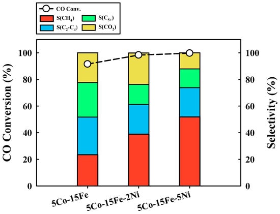 To further study the effect of Ni on the Co-Fe catalysts, we tested the catalytic performance of Co-Fe and Co-Fe-Ni, and the results are shown in Figure 5. There is no drastic change during the experiment as shown in Figure S2. It was found that the addition of Ni to Co-Fe catalysts increased CO conversion from 91.5% to 99.9%. This is because the presence of Ni in catalysts not only leads to high activity for CO hydrogenation but also enhances the reducibility. With increasing nickel content, for the 5Co-15Fe-2Ni/γ-Al2O3 catalyst, the selectivity to CH4 increased from 23.5% to 38.9%, and the selectivity to C2–C4 and C5+ decreased from 28.2% to 22.3% and from 26.0% to 15.1%, respectively, compared to the 5Co-15Fe/γ-Al2O3 catalyst. However, the selectivity to CO2 presents a similar value between 22.3–23.6%, indicating that a small Ni amount in Co-Fe catalysts only affects hydrocarbon selectivity. Alternatively, for the 5Co-15Fe-5Ni/γ-Al2O3 catalyst, the selectivity to CH4 significantly increased to 51.9% with a decrease of CO2 selectivity without changing the selectivity to C2-C4 and C5+. As mentioned above, increasing the Ni amount in Fe catalysts affects the interaction between Fe and Ni resulting in the Ni-Fe alloy phase, which indicates a high methanation reaction. As shown in Figure 5, it could be confirmed that the 5Co-15Fe-2Ni/γ-Al2O3 catalyst showed no significant change in metal phase compared to 5Co-15Fe/γ-Al2O3. However, 5Co-15Fe-5Ni/γ-Al2O3 showed coexistence of Fe and Ni-Fe alloy, resulting in the high selectivity of light hydrocarbon (C1–C4), and low byproduct formation (C5+ and CO2).