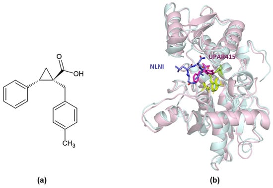 Figure 1. (a) UPAR415 ((1S,2S)-1-(4-methylbenzyl)-2-phenylcyclopropanecarboxylic acid) [41]. (b) superimposition of an StOASS-A monomer (light cyan) in complex with UPAR415 (magenta, PDB id 6z4n, [49]) and an OASS-A monomer from H. influenzae (light pink) in complex with the NLNI tetrapeptide (violet, PDB id 1y7l, [16]), representing the C-terminal sequence of SAT. UPAR415 is inspired to the C-terminal isoleucine residue, which is key for SAT binding to OASS-A and is conserved in the SAT sequences of S. Typhimurium, E. coli, and H. influenzae. The pyridoxal-5′-phosphate cofactor molecules are represented in yellow (StOASS-A) and green (HiOASS-A).