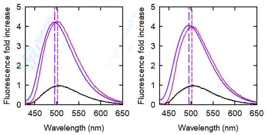 The structure of StOASS-A in complex with UPAR415 has been recently solved. The molecule accommodates in the enzyme active site and occupies, through its carboxylate moiety, the anchoring subsite of the C-terminal tail of SAT (Figure 1b, [16,49]). As demonstrated by the superimposition with the structure of H. influenzae OASS-A (HiOASS-A) bound to the SAT C-terminal decapeptide (PDB id 1y7l, [16]) or pentapeptides [36], the pose of UPAR415 mimics that of the C-terminal isoleucine residue. Due to the steric hindrance of the tolyl substituent, an evident closure movement is not elicited and OASS-A maintains a conformation similar to the one observed in the absence of ligands (PDB id 1oas, [65]). This narrow rearrangement also manifests upon peptides binding to HiOASS-A, which is unable to induce the large conformational changes that are assumed to take place upon full-length SAT binding, leading the transition to the closed conformation [18]; moreover, the peptides bind with much lower affinity to OASS-A (in the low micromolar range), supporting the existence of a more extended interaction network between SAT and OASS-A [36]. The indirect evidence of the different structural rearrangement upon binding of StSAT or UPAR415 is provided by static fluorescence measurements. OASS-A is a pyridoxal-5′-phosphate (PLP)-dependent enzyme and the cofactor can be exploited as an intrinsic probe to monitor the ligand binding to the active site of the enzyme, by changes in fluorescence intensity and emission wavelength [15,36,50,66]. Upon direct excitation of PLP at 412 nm, the emission signal of StOASS-A at 505 nm, in the absence of ligands, shifts to 502 nm in the presence of UPAR415 and 495 nm in the presence of StSAT, respectively (Figure 4a). These blue shifts may indicate the formation of a less polar environment within the active site, possibly associated with a closure or a rearrangement of the pocket leading to water exclusion, which is more pronounced in the case of SAT binding. The same emission behavior is displayed by EcOASS-A, and based on structural data, a comparable conformational change can be hypothesized (Figure 4b).