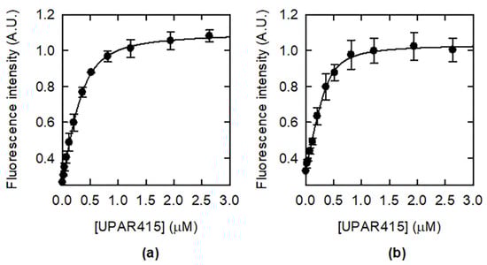Figure 5. Binding of UPAR415 to StOASS-A (a) and EcOASS-A (b) at 25 °C. Fluorescence emission intensities at 500 nm upon excitation at 412 nm were fitted to a tight-binding equation (Equation (5)) giving KD values of 97.3 ± 6.3 nM for StOASS-A and 55.8 ± 8.0 nM for EcOASS-A.