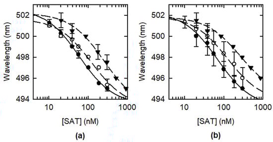Figure 6. StCS (a) and EcCS (b) complex formation in the presence of 2 µM (closed circles), 5 µM (open circles) or 10 µM (closed triangles) UPAR415. The displacement of UPAR415 by SAT from OASS-A active site is followed as wavelength shift as a function of SAT concentration. Data were fitted to a binding isotherm, giving the apparent KD values reported in Table 1. Data represent the mean of technical triplicates and their standard deviations.