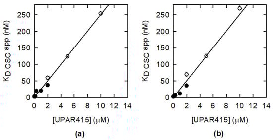 Figure 7. Apparent dissociation constants of StCS (a) and EcCS (b) complexes as a function of UPAR415 concentration, obtained by SPR single-cycle kinetics fitted to a 1:1 binding model (closed circles) and fluorescence titrations (open circles). Data were fitted to Equation (4) (see Materials and Methods, rearranged to derive the apparent dissociation constant KD,app) giving an offset of the order of 10−9 M. This value, which represents extrapolated CS complex dissociation constants, is in good agreement with the independently determined values reported in Table 1 (2.3 nM for both CS complexes).
