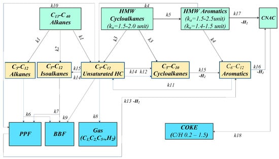 The interdependence between reaction rates (18 reactions) and group concentrations (14 components) is based on the law of mass action according to the reaction network (Figure 2). Moreover, the reaction rate is multiplied by the catalyst deactivation parameter when the concentration of the components calculates (Equation (2)):