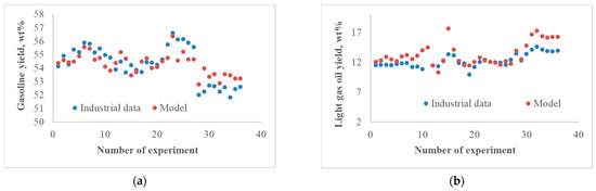 The mathematical model was verified by comparing the calculated data of the product yields and industrial data (Figure 3). A change in the main operating variables of the riser is presented in Table 5. The feedstock composition changed according to Table 6.
