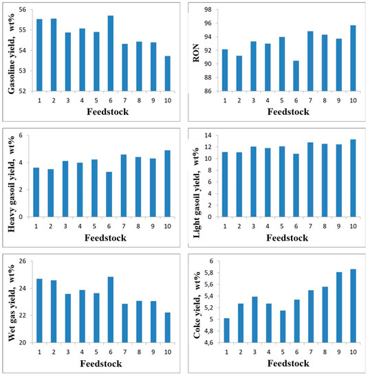 Model-based calculation shows that the gasoline yield is the highest (55.5–55.7 wt%) when the feedstocks with a high content of saturates are converted (C-1, C-2, and C-6 feed). At the same time, the values of RON of the gasoline are lower (90.48–92.15) relative to other feedstock, which have a high content of aromatics. Although the yields of gas are high values (24.6–24.9 wt%), the amount of light (10.81–11.12 wt%) gas oil is lower relative to other feeds.