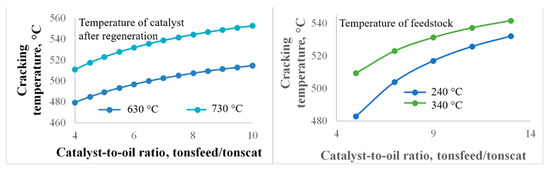 The model takes into account the interdependence between the operating variables of the riser and the regenerator. The cracking temperature depends largely on the temperature of the thermal equilibrium between the feedstock, the catalyst, and the heat of cracking reactions. The initial temperature of the reactions depends on the consumption of the feedstock and regenerated catalyst, as well as on their temperatures and heat capacities (Equation (4)):