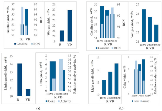Feedstock-induced changes in product yields and RON of gasoline: (a) when vacuum distillate (VD) and residual feedstock (R) are converted; (b) when different ratio of vacuum distillate (VD) and residual feedstock (R) are converted.
