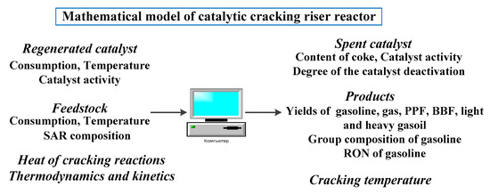 Depending on market needs, the catalytic cracking technology can be aimed at increasing the yield of gasoline, light olefins, or light gasoil, the latter being more relevant to Europe with its high amount of diesel cars [1]. Factors affecting the products’ yields include interacting operating variables in the reactor and the regenerator, catalyst deactivation, and, especially, change in the hydrocarbon type content in the feedstocks. To improve the oil refining depth, the residual fraction involves catalytic cracking units as a feedstock [2,3,4,5]. When the heavy petroleum fractions are converted, the rising content of coke on the catalyst contributes to its deactivation and an increase in the temperature of the regenerated catalyst [6]. In this case, the amount of heat created in the regenerator should not deactivate the catalyst or disturb the heat balance significantly. Moreover, the conversion of catalytic cracking feedstock is limited by the regenerator coke burning ability. This poses a major challenge when using the existing industrial catalytic cracking units, i.e., how to choose the mixed feedstock in order to increase the production of light gas oil, gasoline, or light olefins when using residual fractions; and how to define the optimal amount of residues in the mixed feedstock to prevent an intensive formation of coke and catalyst deactivation. Since change in the composition of feedstock and non-optimum conditions for the catalyst operation may lead to catalyst deactivation by coke and as a result reduce the cracking efficiency, addressing the above challenge is an essential task. Therefore, the rate of coke formation should be optimized accordingly.