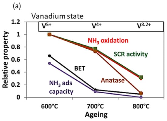 WO3-TiO2 is also an acid catalyst with activity for n-alkane isomerization [55]. These mixed oxides possess both Lewis sites ascribed to surface Ti4+ species and strong Brønsted sites generated by WO3 nanoclusters. WO3-TiO2 was proven to have excellent performances in the reaction of sorbitol transformation into biofuels [122]. The reaction proceeds via successive steps of dehydration and hydrogenation, which requires metal–acid bifunctional catalysts. WO3-TiO2 (acid function) associated with Pt/ZrO2 (metallic function) gave the best performance for the production of C5-C6 hydrocarbons. The main application of WO3-TiO2 (associated with V2O5) is for the NOx abatement by the NH3-SCR process [123,124,125]. While the chemical state of vanadium and tungsten seems to be crucial for a good DeNOx activity [126], acid properties could also play a primary role in the reaction [123,127]. The characterization of V2O5-WO3/TiO2 is examined in Section 4.