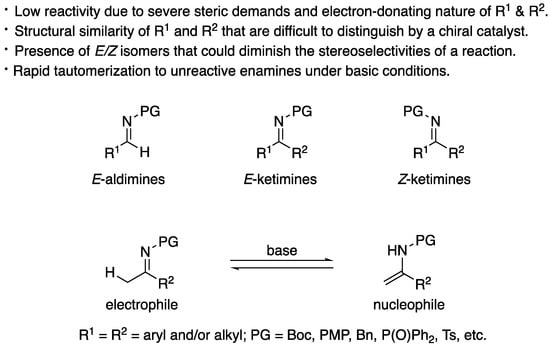 Over the years, the asymmetric catalytic Mannich reaction of ketimines (Scheme 1) has been of significant interest to synthetic and medicinal chemists as a way to access synthetically versatile compounds bearing an α-tertiary amine stereogenic center (selected reviews; [,,,,,,,,,,]). It is because optically pure chiral α-tertiary amines are a key structural motif found in a large number of biologically relevant molecules and natural products (Figure 1) [,,,,]. However, ketimines are much more challenging electrophiles than aldimines for the Mannich and its related reactions (e.g., allylation) due to some notorious structural properties of the formers (Figure 2). In general, diaryl, aryl alkyl, and dialkyl ketimines (i.e., unmodified ketimines) are poor electrophiles because of the severe steric demands and the electron-donating nature of the two groups flanking a C=N bond. Furthermore, these two substituents on a prochiral center are structurally similar thus difficult to distinguish by a chiral catalyst, often leading to low stereoselectivities.