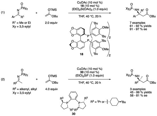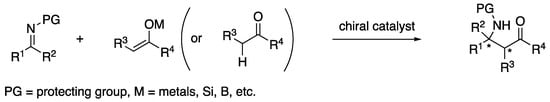 In this review, selected examples published over the past decade or so and some pioneering works are covered. With respect to the transformations related to the ketimine Mannich reaction, only methods that employ enolates or its equivalents (e.g., silyl enol ethers and allyl metals) as nucleophiles to provide β-amino carbonyl compounds or its equivalents are covered, while vinylogous Mannich reactions are included. The asymmetric catalytic methods of ketimines that provide α-amino carbonyl compounds such as Strecker reaction (selected review; []), nitro-Mannich reaction (selected review; []), aza-benzoin reaction (selected references [,]) are not included. The asymmetric umpolung addition of ketimines to electrophiles (selected references; [,,,,,,,]) is beyond the scope of this review. Oxidative asymmetric Mannich reaction is an approach to avoid some drawbacks of preformed ketimines by in situ oxidation of corresponding amines, which is recently reviewed []. Interested readers may wish to refer to these selected articles.