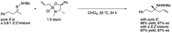 Nonendocyclic ketimines can equilibrate between the E and Z forms in solution at room temperature by an inversion, or rotation, and furthermore, through ketimine–enamine tautomerization, if they have an α-hydrogen atom []. Therefore, ketimines are often available only as a mixture of E and Z isomers that could lead to diminished stereoselectivities in the asymmetric transformations. An interesting observation regarding the E/Z isomerism was reported by Leighton and coworkers in 2004 (Scheme 2) []. Their chiral allylation reagent provided the homoallylic amine in the same yield and ee regardless of the E/Z isomeric ratio of the ketimine used. It was presumed that the ketimine isomerized under the reaction conditions, and one isomer selectively underwent the allylation reaction. Despite this observation, it remains largely elusive how to logically develop such catalytic enantioselective methods. Alternatively, catalytic methods that tolerate N-unsubstituted ketimine salts, thus obviating the E/Z isomerism, have been developed in recent years []. In 2009, Gosselin, Zhang, and coworkers reported the first examples of catalytic hydrogenation of N-unsubstituted ketimine salts (not shown) []. These reported examples bode well for the further development of ketimine Mannich and related transformations.